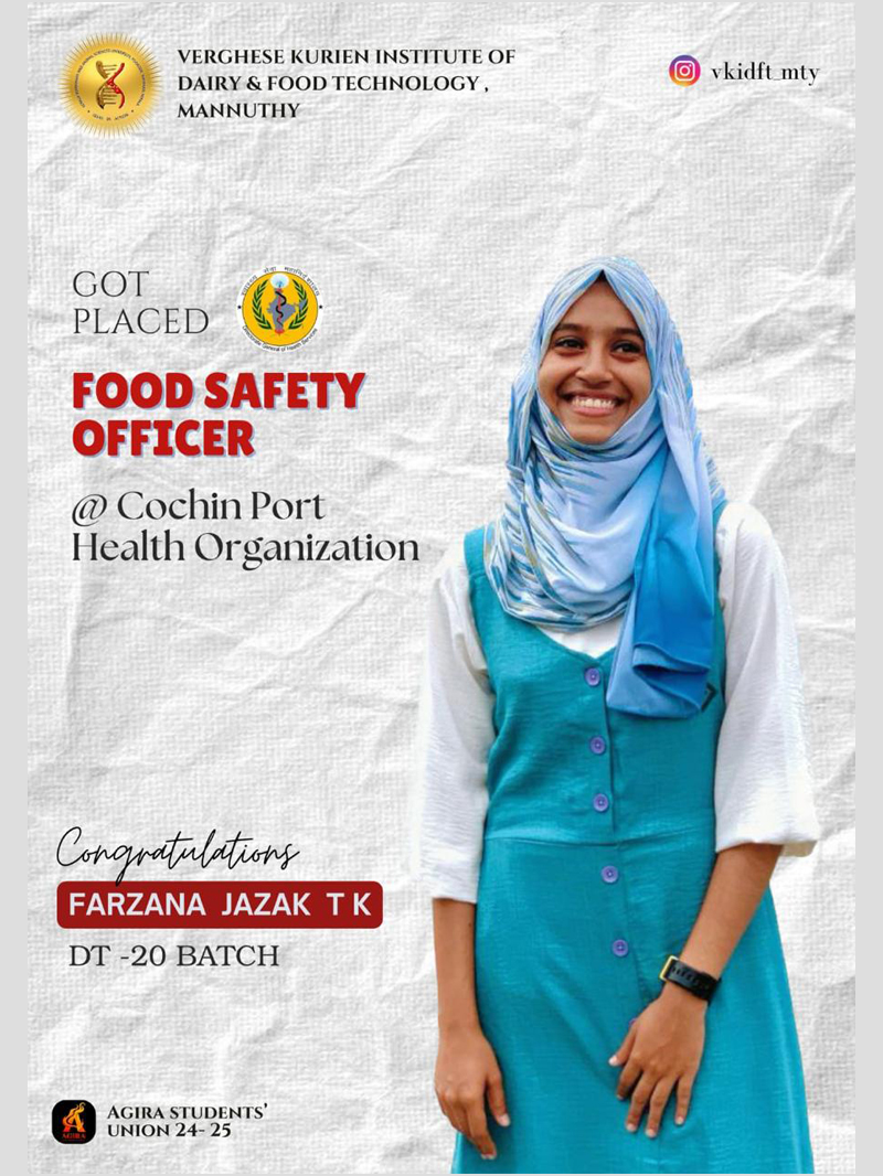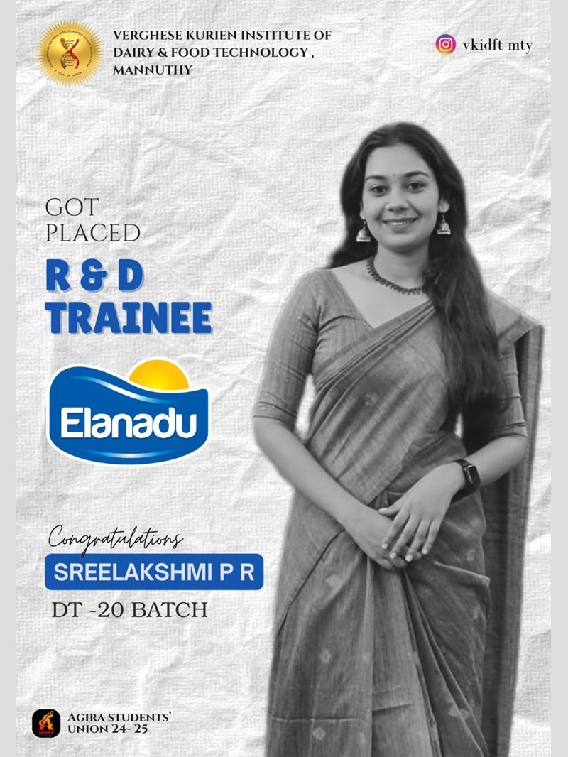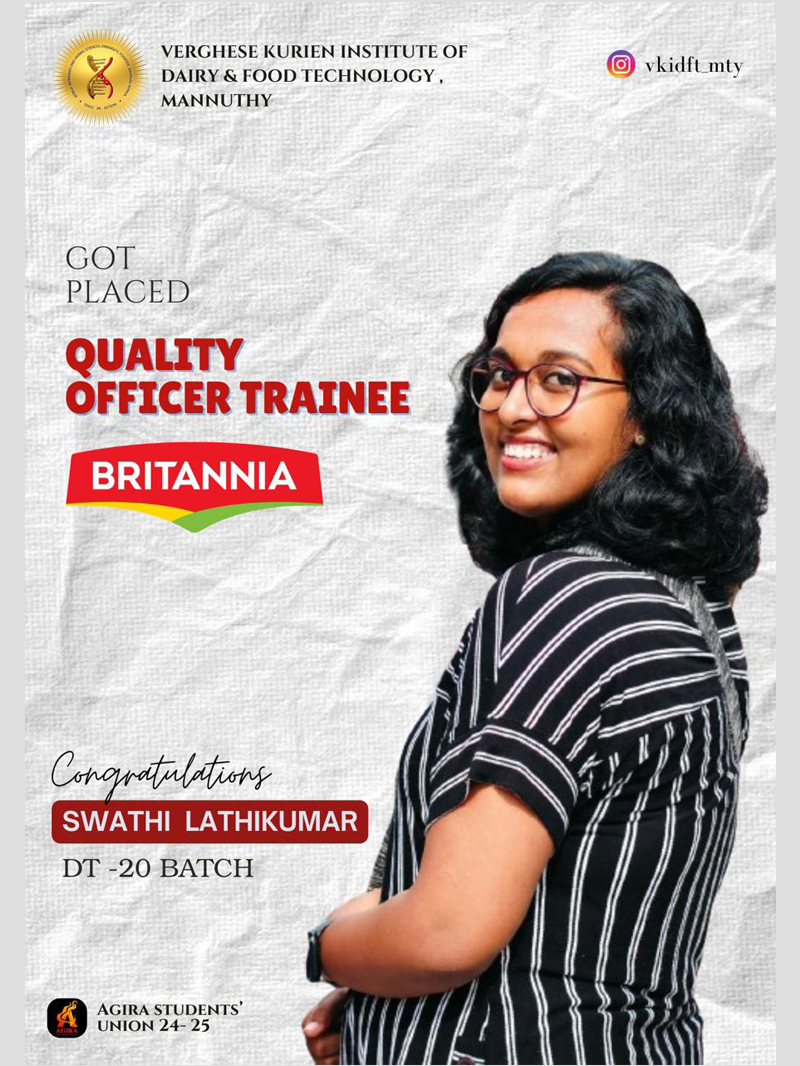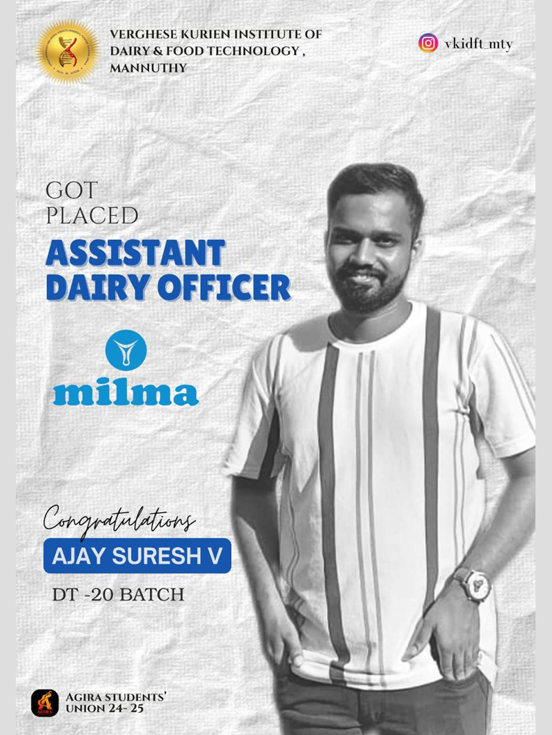 Reputation of this institution is among the top academic colleges in dairy processing; credit goes to our B. Tech graduates. Campus recruitment programmes are conducted for final year students/graduates every year. Reputed firms like Almarai in Saudi Arabia, Schreiber Dynamix Dairies, ITC Foods division, Milma, Hatsun Agro Products etc recruit our B.Tech graduates through campus interview.
